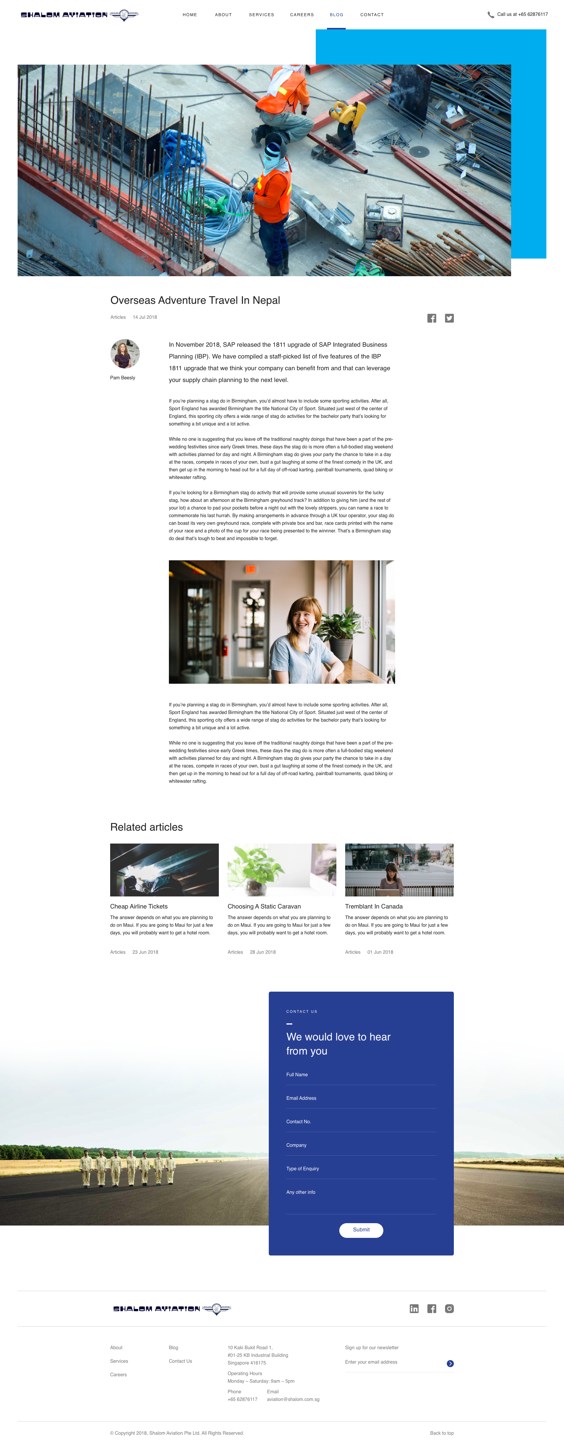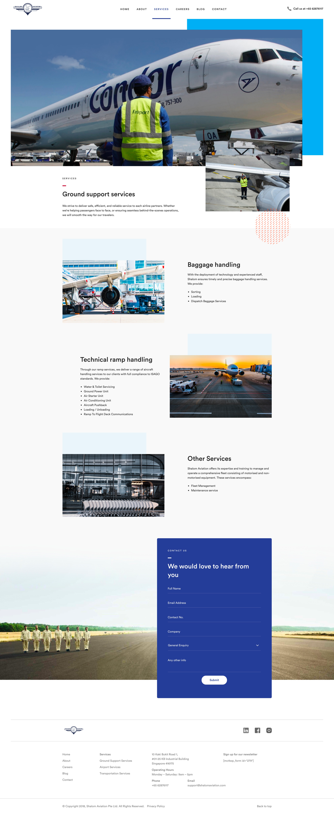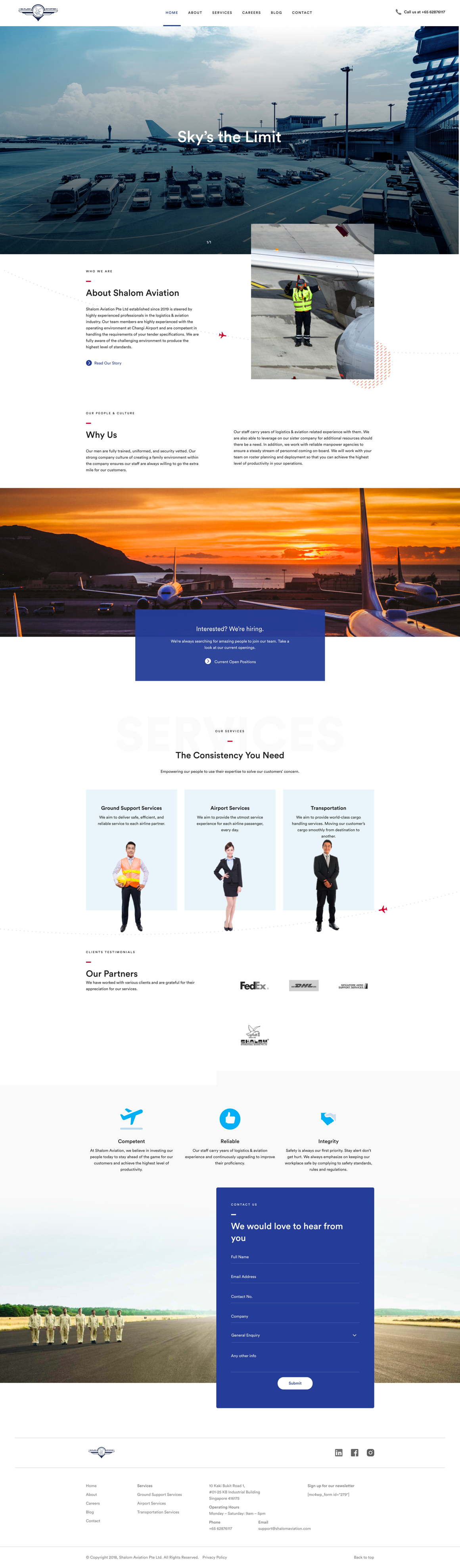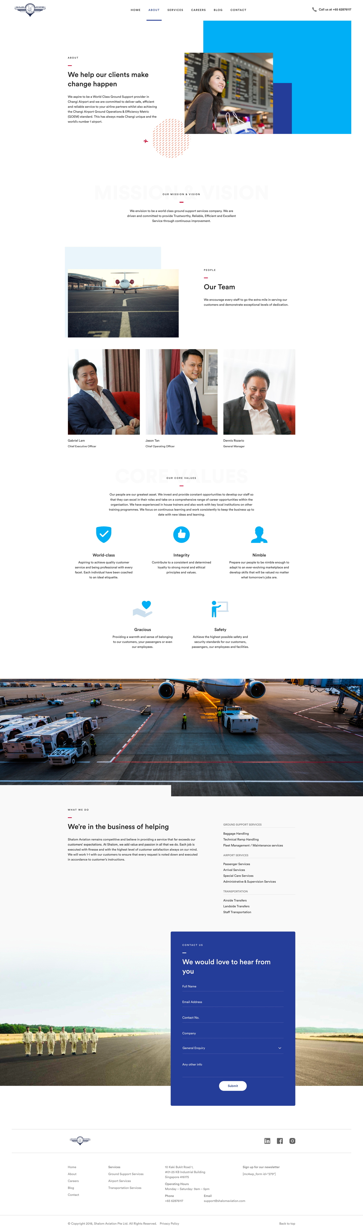 Shalom Aviation provides a range of world class ground support services at Singapore Changi Airport. The website adopts a modern, clean aesthetic with various shades of blue to communicate competency, reliability and safety to its B2B customers.
